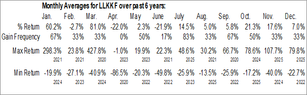 A word of caution: Only 5 years of data is available for shares of LLKKF, perhaps insufficient to create a seasonal profile that accurately gauges the seasonal tendencies influencing the investment. Ideally, while 20 years is preferred, at least 10 years of data is required to perform a seasonal analysis that is considered to be reliable for future seasonal periods.