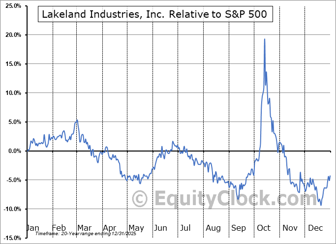 Analysis of the Lakeland Industries, Inc. (NASD:LAKE) seasonal charts above shows that a Buy Date of December 17 and a Sell Date of March 7 has resulted in a geometric average return of 5.33% above the benchmark rate of the S&P 500 Total Return Index over the past 20 years. This seasonal timeframe has shown positive results compared to the benchmark in 14 of those periods. This is a good rate of success and the return strongly outperforms the relative buy-and-hold performance of the stock over the past 20 years by an average of 12.59% per year.