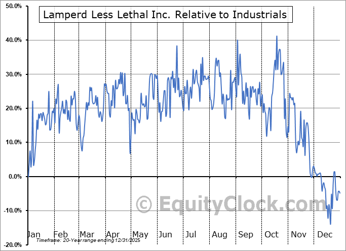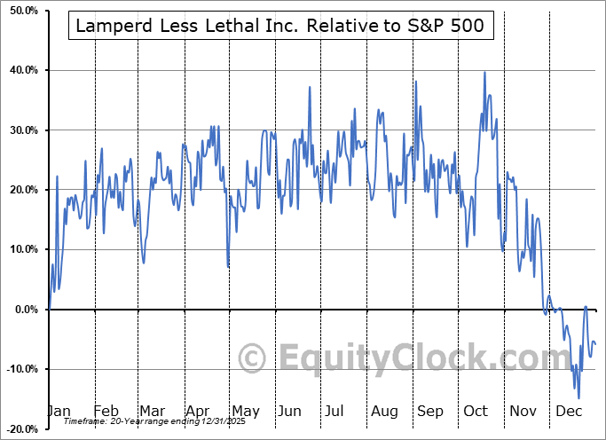 Analysis of the Lamperd Less Lethal Inc. (OTCMKT:LLLI) seasonal charts above shows that a Buy Date of December 17 and a Sell Date of April 12 has resulted in a geometric average return of 11.2% above the benchmark rate of the S&P 500 Total Return Index over the past 20 years. This seasonal timeframe has shown positive results compared to the benchmark in 13 of those periods. This is a good rate of success and the return strongly outperforms the relative buy-and-hold performance of the stock over the past 20 years by an average of 39.47% per year.