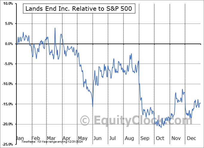 Analysis of the Lands End Inc. (NASD:LE) seasonal charts above shows that a Buy Date of October 19 and a Sell Date of January 10 has resulted in a geometric average return of 11.07% above the benchmark rate of the S&P 500 Total Return Index over the past 10 years. This seasonal timeframe has shown positive results compared to the benchmark in 8 of those periods. This is a very good rate of success and the return strongly outperforms the relative buy-and-hold performance of the stock over the past 10 years by an average of 34.37% per year.