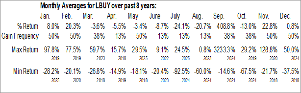 A word of caution: Only 8 years of data is available for shares of LBUY, perhaps insufficient to create a seasonal profile that accurately gauges the seasonal tendencies influencing the investment. Ideally, while 20 years is preferred, at least 10 years of data is required to perform a seasonal analysis that is considered to be reliable for future seasonal periods.