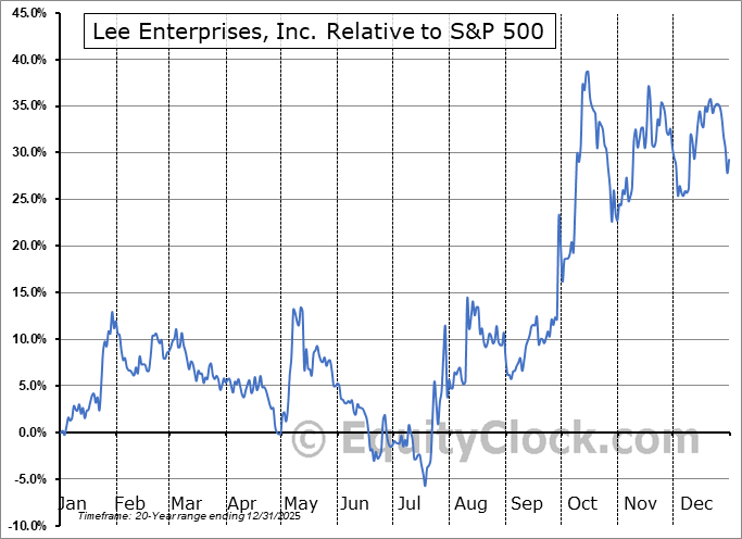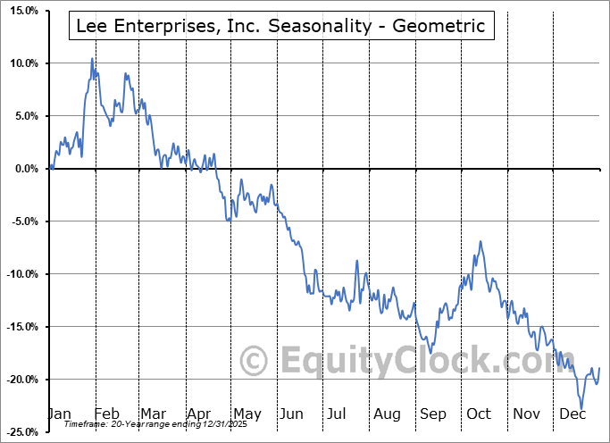 Analysis of the Lee Enterprises, Inc. (NASD:LEE) seasonal charts above shows that a Buy Date of September 10 and a Sell Date of January 27 has resulted in a geometric average return of 1.52% above the benchmark rate of the S&P 500 Total Return Index over the past 20 years. This seasonal timeframe has shown positive results compared to the benchmark in 12 of those periods. This is a fair rate of success and the return strongly outperforms the relative buy-and-hold performance of the stock over the past 20 years by an average of 28.23% per year.