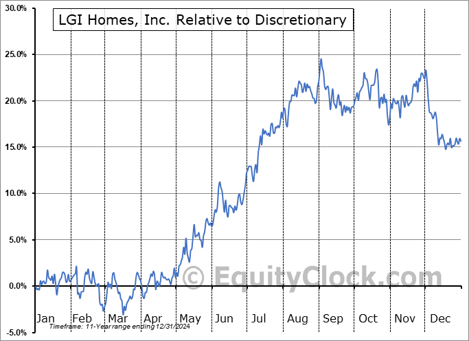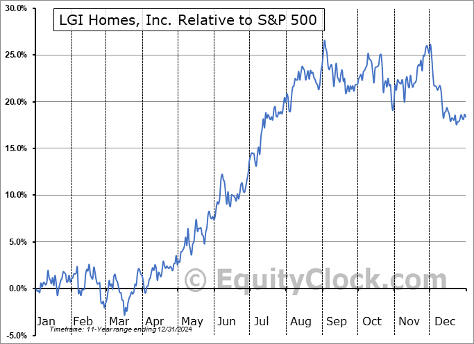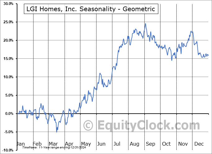Analysis of the LGI Homes, Inc. (NASD:LGIH) seasonal charts above shows that a Buy Date of April 2 and a Sell Date of August 1 has resulted in a geometric average return of 16.71% above the benchmark rate of the S&P 500 Total Return Index over the past 11 years. This seasonal timeframe has shown positive results compared to the benchmark in 10 of those periods. This is an excellent rate of success and the return strongly outperforms the relative buy-and-hold performance of the stock over the past 11 years by an average of 14.41% per year.