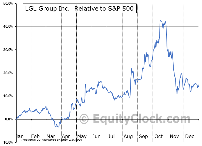 Analysis of the LGL Group Inc. (AMEX:LGL) seasonal charts above shows that a Buy Date of December 15 and a Sell Date of March 4 has resulted in a geometric average return of 7.19% above the benchmark rate of the S&P 500 Total Return Index over the past 20 years. This seasonal timeframe has shown positive results compared to the benchmark in 14 of those periods. This is a good rate of success and the return strongly outperforms the relative buy-and-hold performance of the stock over the past 20 years by an average of 16.97% per year.