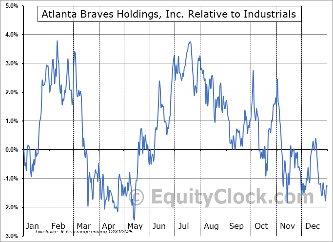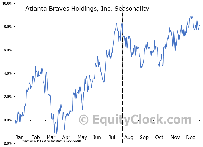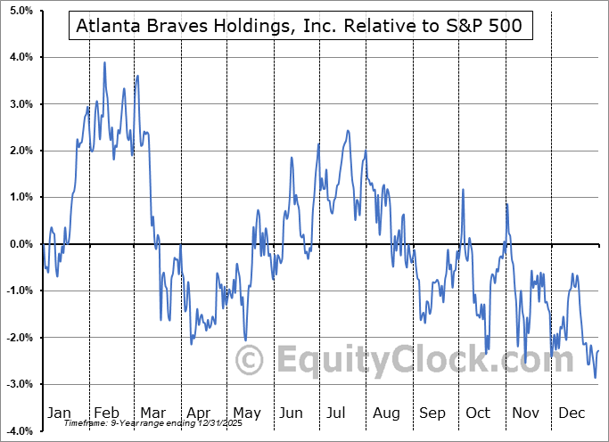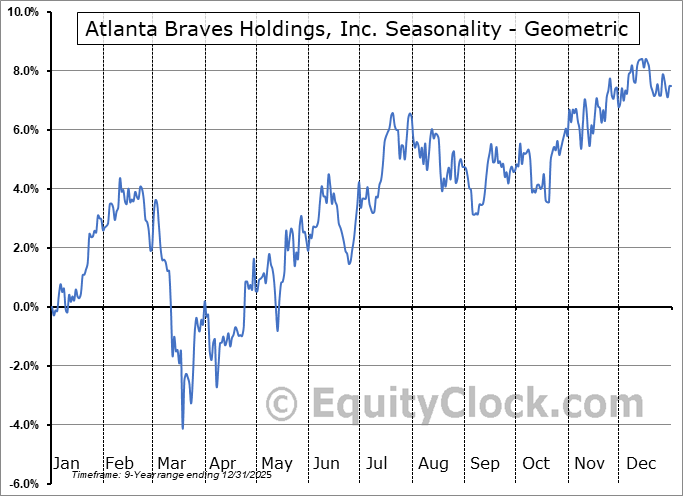 Analysis of the Atlanta Braves Holdings, Inc. (NASD:BATRK) seasonal charts above shows that a Buy Date of September 1 and a Sell Date of January 28 has resulted in a geometric average return of 6.88% above the benchmark rate of the S&P 500 Total Return Index over the past 8 years. This seasonal timeframe has shown positive results compared to the benchmark in 6 of those periods. This is a good rate of success and the return strongly outperforms the relative buy-and-hold performance of the stock over the past 8 years by an average of 12.6% per year.