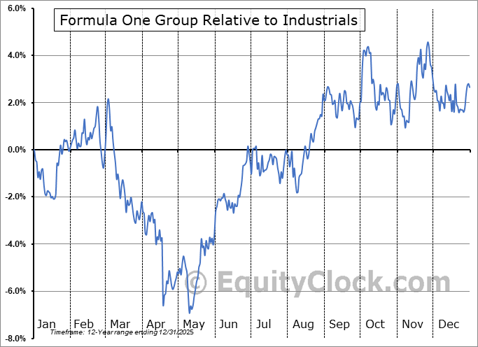 Analysis of the Formula One Group (NASD:FWONA) seasonal charts above shows that a Buy Date of May 14 and a Sell Date of October 6 has resulted in a geometric average return of 7.56% above the benchmark rate of the S&P 500 Total Return Index over the past 12 years. This seasonal timeframe has shown positive results compared to the benchmark in 10 of those periods. This is a very good rate of success and the return strongly outperforms the relative buy-and-hold performance of the stock over the past 12 years by an average of 10.74% per year.