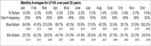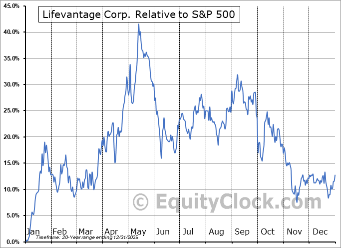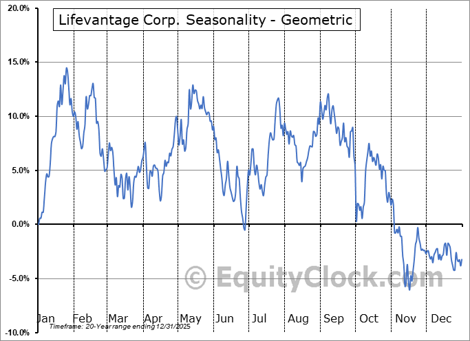 Analysis of the Lifevantage Corp. (NASD:LFVN) seasonal charts above shows that a Buy Date of July 13 and a Sell Date of October 12 has resulted in a geometric average return of 4.12% above the benchmark rate of the S&P 500 Total Return Index over the past 20 years. This seasonal timeframe has shown positive results compared to the benchmark in 13 of those periods. This is a good rate of success and the return strongly outperforms the relative buy-and-hold performance of the stock over the past 20 years by an average of 16.83% per year.
