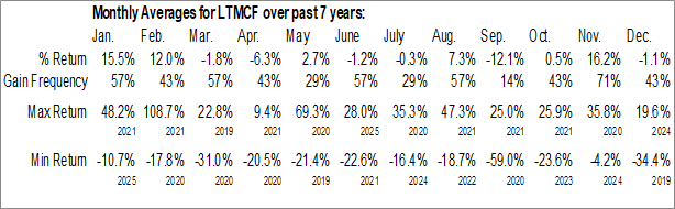 A word of caution: Only 6 years of data is available for shares of LTMCF, perhaps insufficient to create a seasonal profile that accurately gauges the seasonal tendencies influencing the investment. Ideally, while 20 years is preferred, at least 10 years of data is required to perform a seasonal analysis that is considered to be reliable for future seasonal periods.