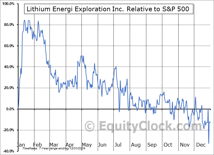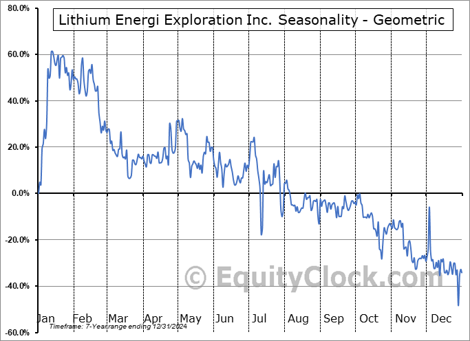 Analysis of the Lithium Energi Exploration Inc. (OTCMKT:LXENF) seasonal charts above shows that a Buy Date of October 23 and a Sell Date of January 13 has resulted in a geometric average return of 62.53% above the benchmark rate of the S&P 500 Total Return Index over the past 7 years. This seasonal timeframe has shown positive results compared to the benchmark in 6 of those periods. This is a very good rate of success and the return strongly outperforms the relative buy-and-hold performance of the stock over the past 7 years by an average of 104.15% per year.