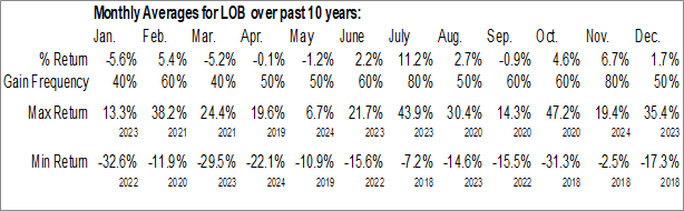 A word of caution: Only 9 years of data is available for shares of LOB, perhaps insufficient to create a seasonal profile that accurately gauges the seasonal tendencies influencing the investment. Ideally, while 20 years is preferred, at least 10 years of data is required to perform a seasonal analysis that is considered to be reliable for future seasonal periods.