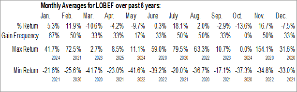 A word of caution: Only 6 years of data is available for shares of LOBEF, perhaps insufficient to create a seasonal profile that accurately gauges the seasonal tendencies influencing the investment. Ideally, while 20 years is preferred, at least 10 years of data is required to perform a seasonal analysis that is considered to be reliable for future seasonal periods.