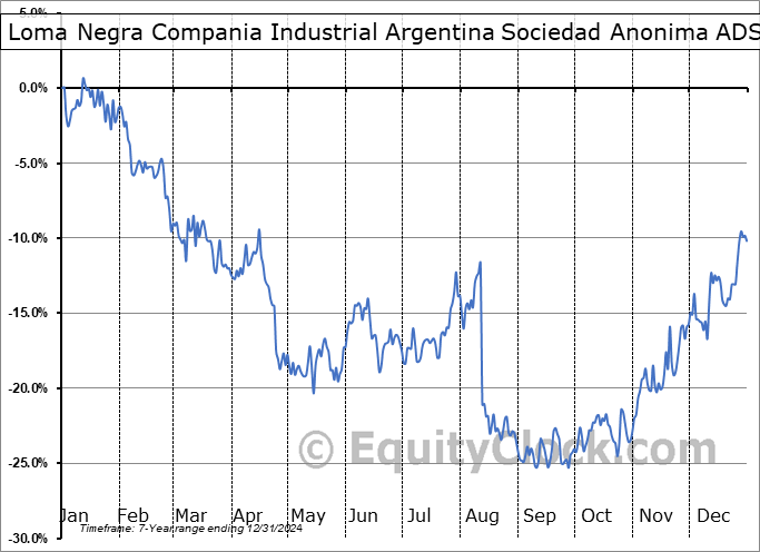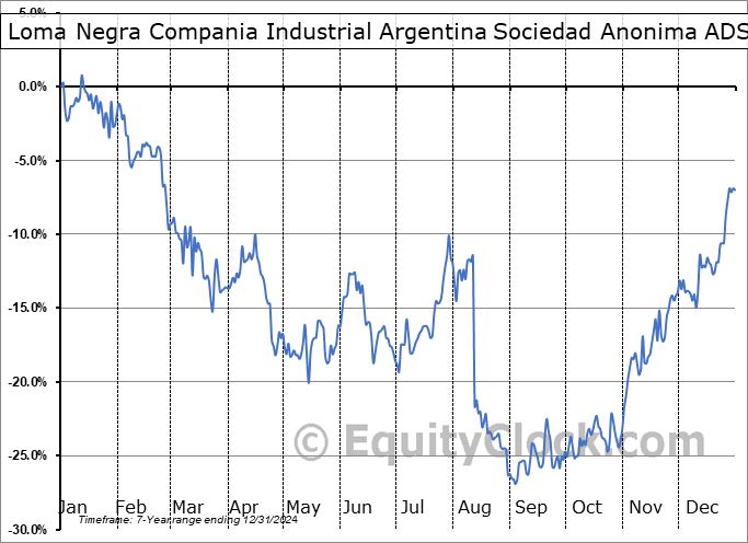 Analysis of the Loma Negra Compania Industrial Argentina Sociedad Anonima ADS (NYSE:LOMA) seasonal charts above shows that a Buy Date of September 2 and a Sell Date of January 1 has resulted in a geometric average return of 23.76% above the benchmark rate of the S&P 500 Total Return Index over the past 7 years. This seasonal timeframe has shown positive results compared to the benchmark in 6 of those periods. This is a very good rate of success and the return strongly outperforms the relative buy-and-hold performance of the stock over the past 7 years by an average of 42.38% per year.