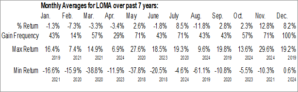 A word of caution: Only 7 years of data is available for shares of LOMA, perhaps insufficient to create a seasonal profile that accurately gauges the seasonal tendencies influencing the investment. Ideally, while 20 years is preferred, at least 10 years of data is required to perform a seasonal analysis that is considered to be reliable for future seasonal periods.