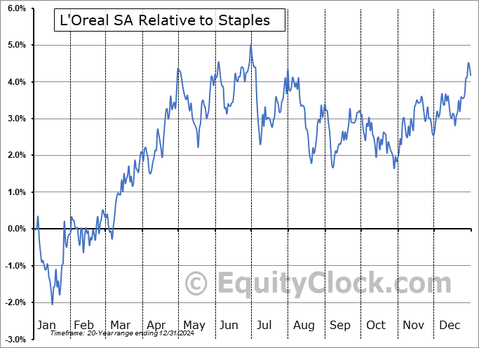 Analysis of the L’Oreal SA (OTCMKT:LRLCY) seasonal charts above shows that a Buy Date of January 23 and a Sell Date of April 30 has resulted in a geometric average return of 4.28% above the benchmark rate of the S&P 500 Total Return Index over the past 20 years. This seasonal timeframe has shown positive results compared to the benchmark in 16 of those periods. This is a very good rate of success and the return strongly outperforms the relative buy-and-hold performance of the stock over the past 20 years by an average of 5.95% per year.