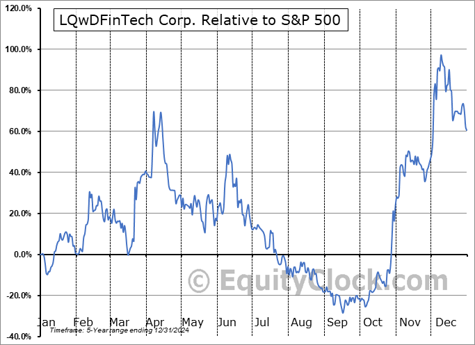 Analysis of the LQwDFinTech Corp. (TSXV:LQWD.V) seasonal charts above shows that a Buy Date of August 15 and a Sell Date of November 5 has resulted in a geometric average return of 31.53% above the benchmark rate of the S&P 500 Total Return Index over the past 5 years. This seasonal timeframe has shown positive results compared to the benchmark in 5 of those periods. This is an excellent rate of success and the return strongly outperforms the relative buy-and-hold performance of the stock over the past 5 years by an average of 40.36% per year.