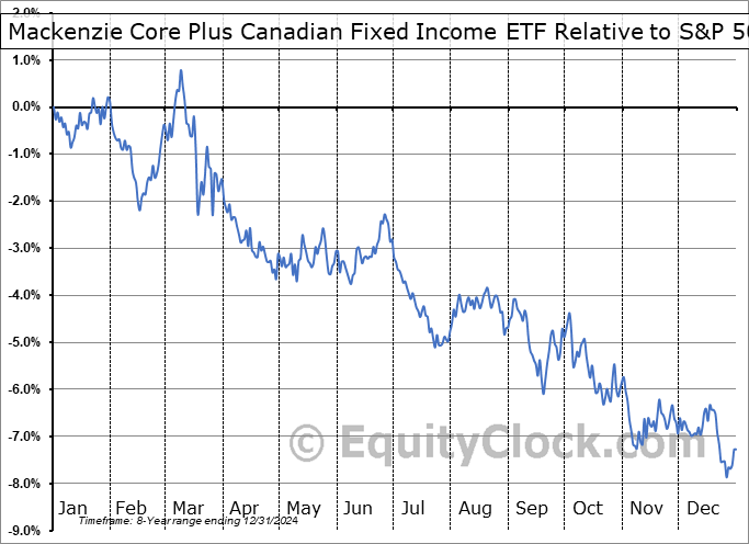 Analysis of the Mackenzie Core Plus Canadian Fixed Income ETF (TSE:MKB.TO) seasonal charts above shows that a Buy Date of February 15 and a Sell Date of May 24 has resulted in a geometric average return of 1.35% above the benchmark rate of the S&P 500 Total Return Index over the past 8 years. This seasonal timeframe has shown positive results compared to the benchmark in 6 of those periods. This is a good rate of success and the return strongly outperforms the relative buy-and-hold performance of the stock over the past 8 years by an average of 12.11% per year.