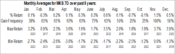 To download MKB.TO seasonal chart data, please log in or Subscribe.