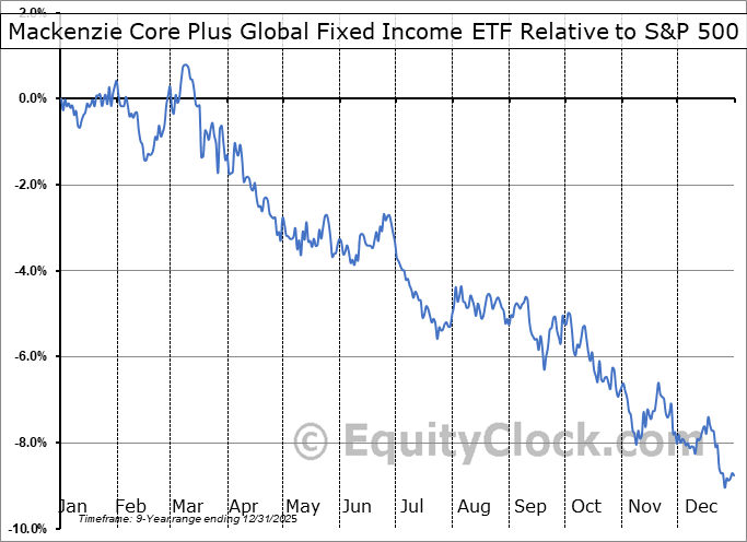 Analysis of the Mackenzie Core Plus Global Fixed Income ETF (TSE:MGB.TO) seasonal charts above shows that a Buy Date of February 15 and a Sell Date of May 9 has resulted in a geometric average return of 0.66% above the benchmark rate of the S&P 500 Total Return Index over the past 8 years. This seasonal timeframe has shown positive results compared to the benchmark in 5 of those periods. This is a fair rate of success and the return strongly outperforms the relative buy-and-hold performance of the stock over the past 8 years by an average of 12.43% per year.
