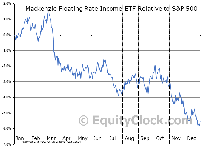 Analysis of the Mackenzie Floating Rate Income ETF (TSE:MFT.TO) seasonal charts above shows that a Buy Date of February 15 and a Sell Date of May 12 has resulted in a geometric average return of 1.12% above the benchmark rate of the S&P 500 Total Return Index over the past 8 years. This seasonal timeframe has shown positive results compared to the benchmark in 5 of those periods. This is a fair rate of success and the return strongly outperforms the relative buy-and-hold performance of the stock over the past 8 years by an average of 10.11% per year.
