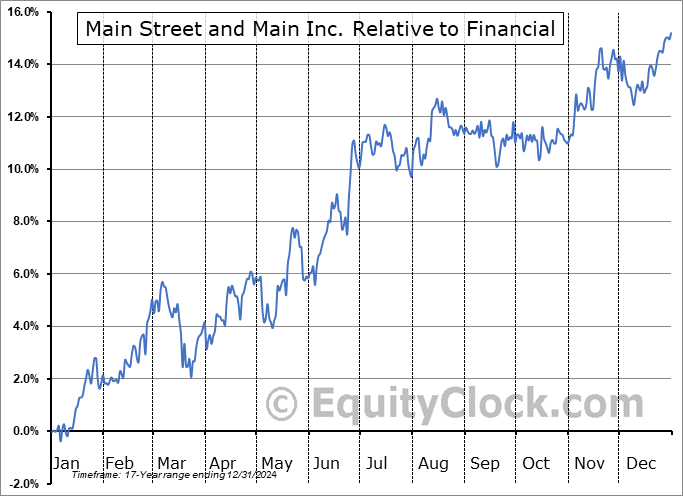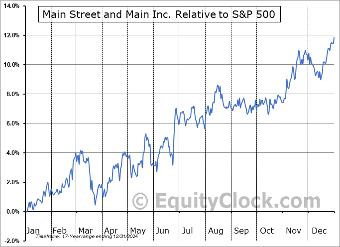 Analysis of the Main Street and Main Inc. (NYSE:MAIN) seasonal charts above shows that a Buy Date of October 14 and a Sell Date of March 7 has resulted in a geometric average return of 6.33% above the benchmark rate of the S&P 500 Total Return Index over the past 17 years. This seasonal timeframe has shown positive results compared to the benchmark in 15 of those periods. This is a very good rate of success, but the return underperforms the relative buy-and-hold performance of the stock over the past 17 years by an average of 0.58% per year.