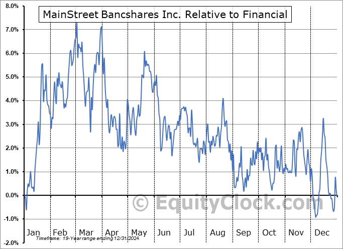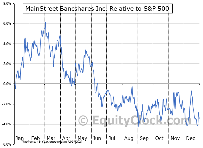 Analysis of the MainStreet Bancshares Inc. (NASD:MNSB) seasonal charts above shows that a Buy Date of December 8 and a Sell Date of March 1 has resulted in a geometric average return of 4.72% above the benchmark rate of the S&P 500 Total Return Index over the past 19 years. This seasonal timeframe has shown positive results compared to the benchmark in 14 of those periods. This is a good rate of success and the return strongly outperforms the relative buy-and-hold performance of the stock over the past 19 years by an average of 11.47% per year.