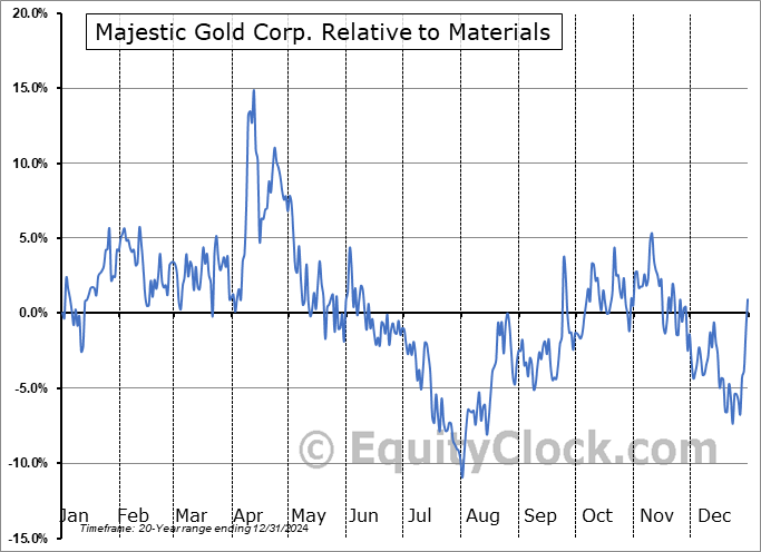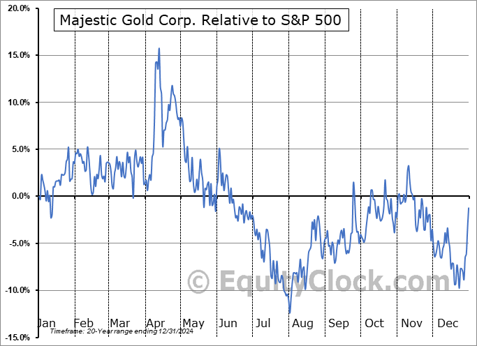 Analysis of the Majestic Gold Corp. (TSXV:MJS.V) seasonal charts above shows that a Buy Date of December 23 and a Sell Date of April 9 has resulted in a geometric average return of 15.27% above the benchmark rate of the S&P 500 Total Return Index over the past 20 years. This seasonal timeframe has shown positive results compared to the benchmark in 16 of those periods. This is a very good rate of success and the return strongly outperforms the relative buy-and-hold performance of the stock over the past 20 years by an average of 33.47% per year.