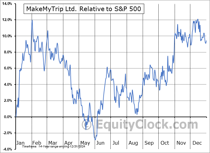 Analysis of the MakeMyTrip Ltd. (NASD:MMYT) seasonal charts above shows that a Buy Date of August 17 and a Sell Date of November 5 has resulted in a geometric average return of 9.64% above the benchmark rate of the S&P 500 Total Return Index over the past 14 years. This seasonal timeframe has shown positive results compared to the benchmark in 10 of those periods. This is a good rate of success and the return strongly outperforms the relative buy-and-hold performance of the stock over the past 14 years by an average of 13.05% per year.