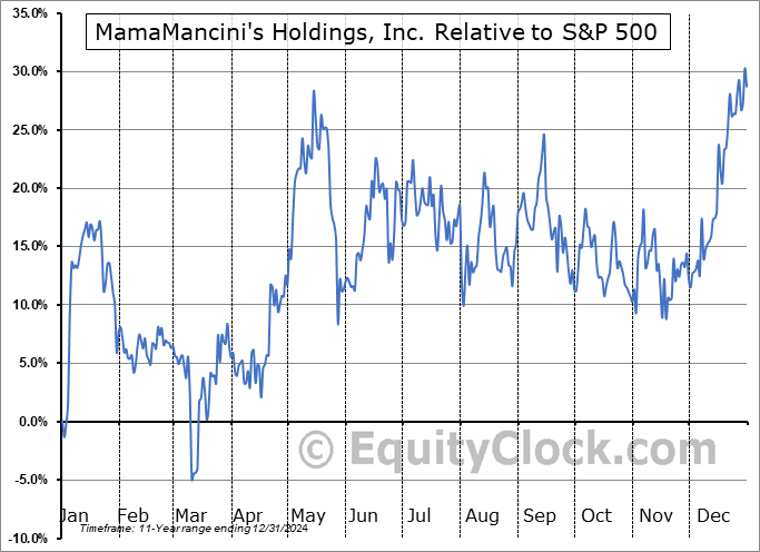 Analysis of the MamaMancini’s Holdings, Inc. (NASD:MAMA) seasonal charts above shows that a Buy Date of March 10 and a Sell Date of June 17 has resulted in a geometric average return of 20.4% above the benchmark rate of the S&P 500 Total Return Index over the past 11 years. This seasonal timeframe has shown positive results compared to the benchmark in 9 of those periods. This is a very good rate of success and the return strongly outperforms the relative buy-and-hold performance of the stock over the past 11 years by an average of 22.24% per year.