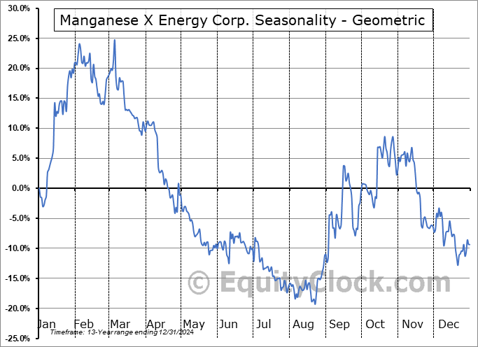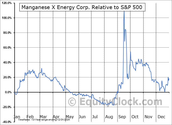 Analysis of the Manganese X Energy Corp. (OTCMKT:MNXXF) seasonal charts above shows that a Buy Date of December 21 and a Sell Date of March 10 has resulted in a geometric average return of 21.15% above the benchmark rate of the S&P 500 Total Return Index over the past 13 years. This seasonal timeframe has shown positive results compared to the benchmark in 11 of those periods. This is a very good rate of success and the return strongly outperforms the relative buy-and-hold performance of the stock over the past 13 years by an average of 41.98% per year.