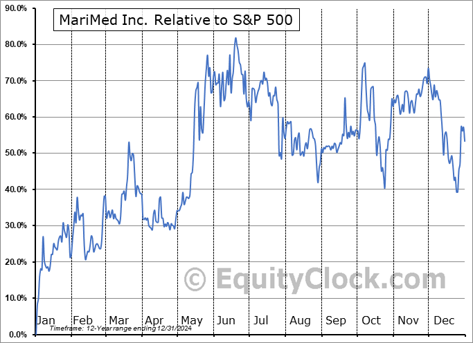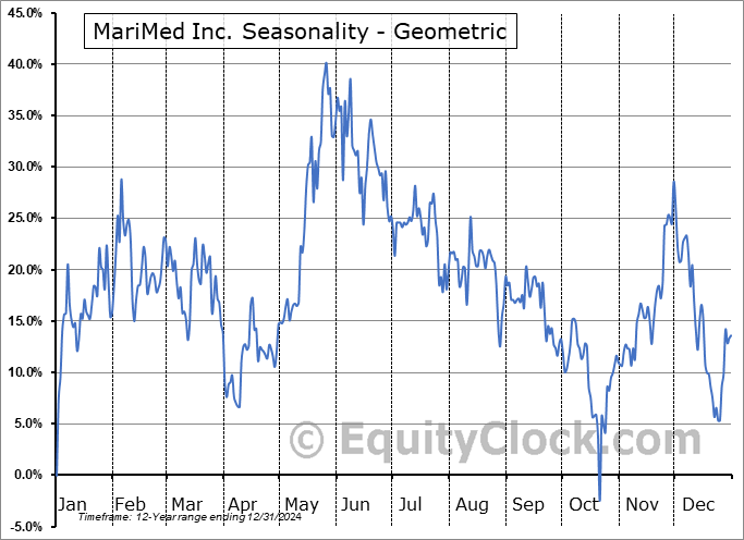 Analysis of the MariMed Inc. (OTCMKT:MRMD) seasonal charts above shows that a Buy Date of December 22 and a Sell Date of March 13 has resulted in a geometric average return of 21.37% above the benchmark rate of the S&P 500 Total Return Index over the past 12 years. This seasonal timeframe has shown positive results compared to the benchmark in 10 of those periods. This is a very good rate of success and the return strongly outperforms the relative buy-and-hold performance of the stock over the past 12 years by an average of 27.1% per year.