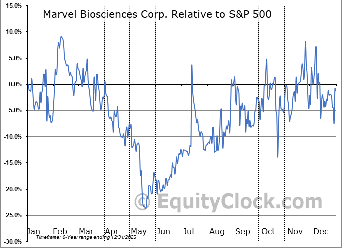 Analysis of the Marvel Biosciences Corp. (TSXV:MRVL.V) seasonal charts above shows that a Buy Date of July 2 and a Sell Date of November 26 has resulted in a geometric average return of 13.62% above the benchmark rate of the S&P 500 Total Return Index over the past 6 years. This seasonal timeframe has shown positive results compared to the benchmark in 6 of those periods. This is an excellent rate of success and the return strongly outperforms the relative buy-and-hold performance of the stock over the past 6 years by an average of 29.91% per year.