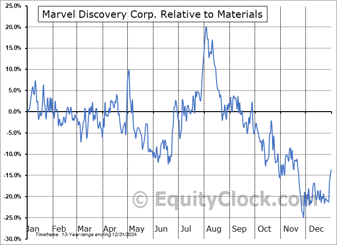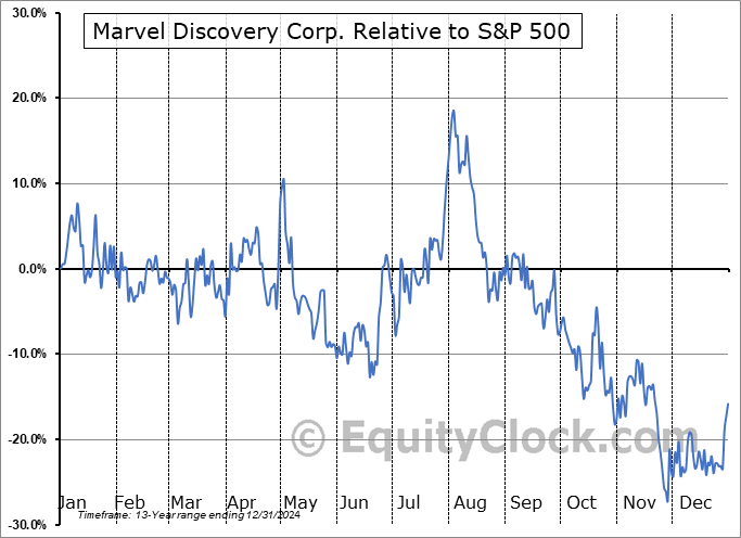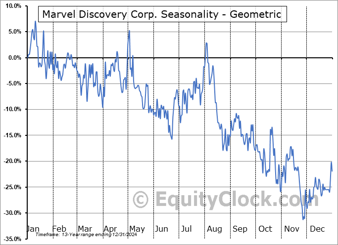Analysis of the Marvel Discovery Corp. (TSXV:MARV.V) seasonal charts above shows that a Buy Date of November 28 and a Sell Date of April 15 has resulted in a geometric average return of 12.03% above the benchmark rate of the S&P 500 Total Return Index over the past 13 years. This seasonal timeframe has shown positive results compared to the benchmark in 10 of those periods. This is a good rate of success and the return strongly outperforms the relative buy-and-hold performance of the stock over the past 13 years by an average of 43.26% per year.