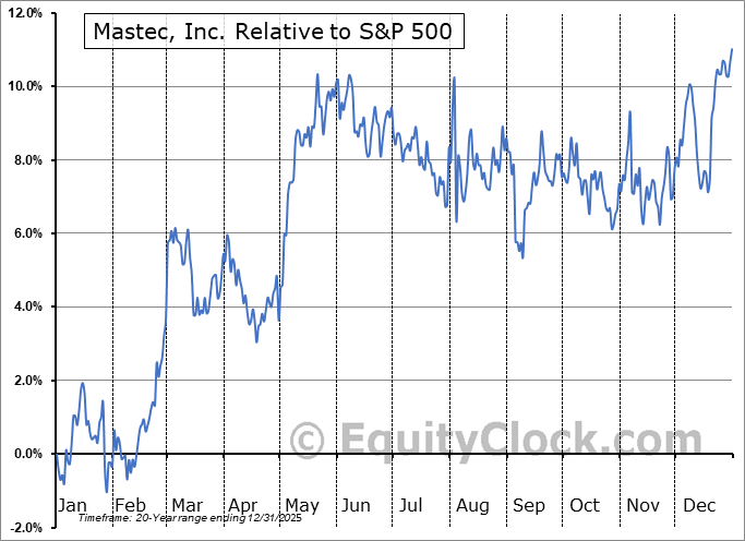 Analysis of the Mastec, Inc. (NYSE:MTZ) seasonal charts above shows that a Buy Date of November 13 and a Sell Date of March 1 has resulted in a geometric average return of 9.49% above the benchmark rate of the S&P 500 Total Return Index over the past 20 years. This seasonal timeframe has shown positive results compared to the benchmark in 16 of those periods. This is a very good rate of success and the return strongly outperforms the relative buy-and-hold performance of the stock over the past 20 years by an average of 5.74% per year.