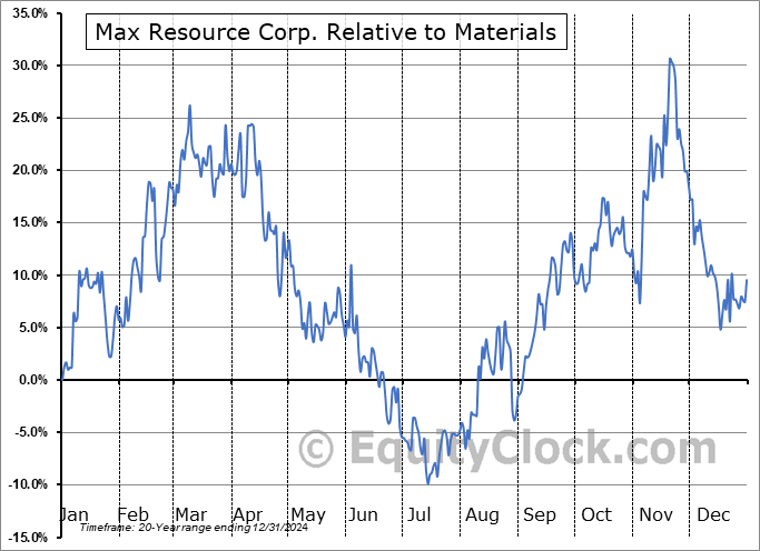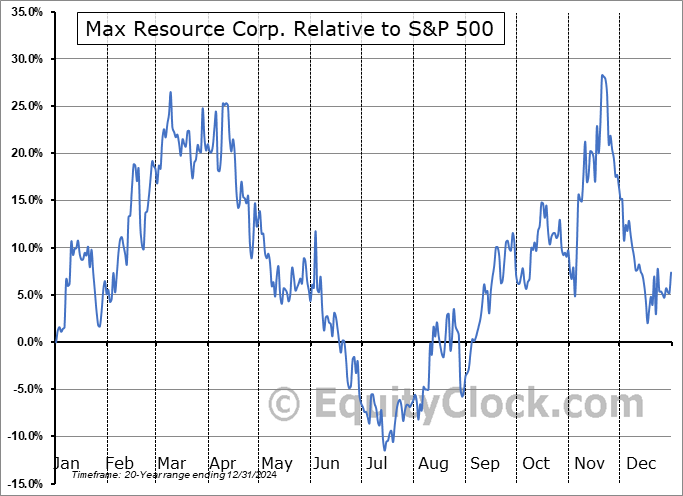 Analysis of the Max Resource Corp. (TSXV:MAX.V) seasonal charts above shows that a Buy Date of December 16 and a Sell Date of April 3 has resulted in a geometric average return of 15.23% above the benchmark rate of the S&P 500 Total Return Index over the past 20 years. This seasonal timeframe has shown positive results compared to the benchmark in 14 of those periods. This is a good rate of success and the return strongly outperforms the relative buy-and-hold performance of the stock over the past 20 years by an average of 45.69% per year.