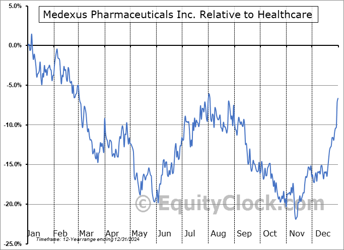 Analysis of the Medexus Pharmaceuticals Inc. (TSE:MDP.TO) seasonal charts above shows that a Buy Date of June 2 and a Sell Date of August 25 has resulted in a geometric average return of 13.94% above the benchmark rate of the S&P 500 Total Return Index over the past 12 years. This seasonal timeframe has shown positive results compared to the benchmark in 9 of those periods. This is a good rate of success and the return strongly outperforms the relative buy-and-hold performance of the stock over the past 12 years by an average of 31.17% per year.