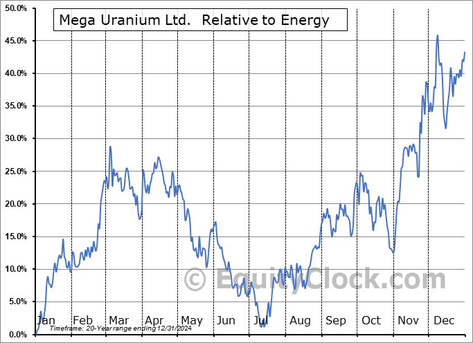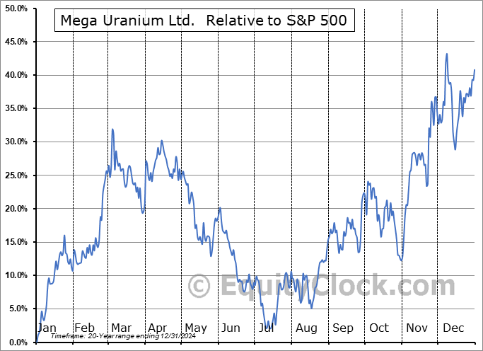 Analysis of the Mega Uranium Ltd. (TSE:MGA.TO) seasonal charts above shows that a Buy Date of October 31 and a Sell Date of January 19 has resulted in a geometric average return of 12.81% above the benchmark rate of the S&P 500 Total Return Index over the past 20 years. This seasonal timeframe has shown positive results compared to the benchmark in 15 of those periods. This is a good rate of success and the return strongly outperforms the relative buy-and-hold performance of the stock over the past 20 years by an average of 21.03% per year.