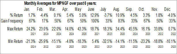 A word of caution: Only 6 years of data is available for shares of MPNGF, perhaps insufficient to create a seasonal profile that accurately gauges the seasonal tendencies influencing the investment. Ideally, while 20 years is preferred, at least 10 years of data is required to perform a seasonal analysis that is considered to be reliable for future seasonal periods.
