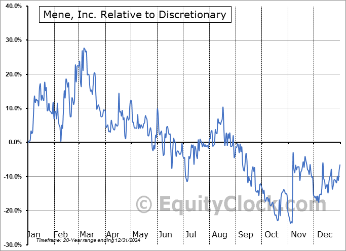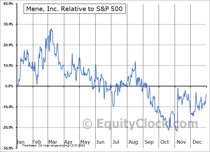 Analysis of the Mene, Inc. (TSXV:MENE.V) seasonal charts above shows that a Buy Date of December 9 and a Sell Date of March 1 has resulted in a geometric average return of 16.3% above the benchmark rate of the S&P 500 Total Return Index over the past 20 years. This seasonal timeframe has shown positive results compared to the benchmark in 14 of those periods. This is a good rate of success and the return strongly outperforms the relative buy-and-hold performance of the stock over the past 20 years by an average of 48.68% per year.
