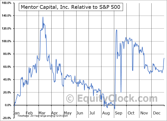 Analysis of the Mentor Capital, Inc. (OTCMKT:MNTR) seasonal charts above shows that a Buy Date of December 27 and a Sell Date of March 16 has resulted in a geometric average return of 34.11% above the benchmark rate of the S&P 500 Total Return Index over the past 20 years. This seasonal timeframe has shown positive results compared to the benchmark in 13 of those periods. This is a good rate of success and the return strongly outperforms the relative buy-and-hold performance of the stock over the past 20 years by an average of 44.75% per year.