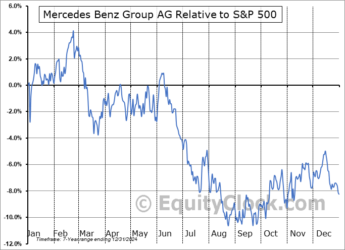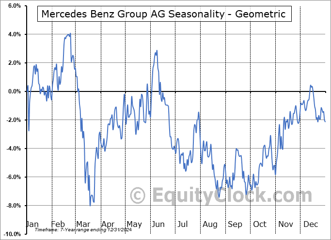Analysis of the Mercedes Benz Group AG (OTCMKT:MBGYY) seasonal charts above shows that a Buy Date of September 4 and a Sell Date of January 10 has resulted in a geometric average return of 6.37% above the benchmark rate of the S&P 500 Total Return Index over the past 7 years. This seasonal timeframe has shown positive results compared to the benchmark in 5 of those periods. This is a good rate of success and the return strongly outperforms the relative buy-and-hold performance of the stock over the past 7 years by an average of 20.3% per year.