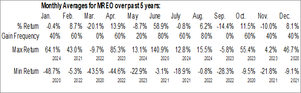 A word of caution: Only 5 years of data is available for shares of MREO, perhaps insufficient to create a seasonal profile that accurately gauges the seasonal tendencies influencing the investment. Ideally, while 20 years is preferred, at least 10 years of data is required to perform a seasonal analysis that is considered to be reliable for future seasonal periods.