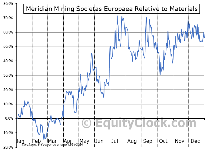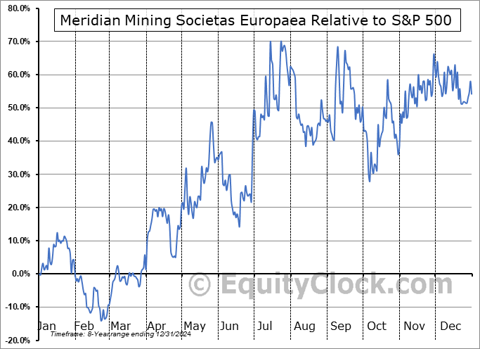 Analysis of the Meridian Mining Societas Europaea (TSE:MNO.TO) seasonal charts above shows that a Buy Date of November 27 and a Sell Date of April 9 has resulted in a geometric average return of 8.73% above the benchmark rate of the S&P 500 Total Return Index over the past 8 years. This seasonal timeframe has shown positive results compared to the benchmark in 6 of those periods. This is a good rate of success and the return strongly outperforms the relative buy-and-hold performance of the stock over the past 8 years by an average of 28.82% per year.