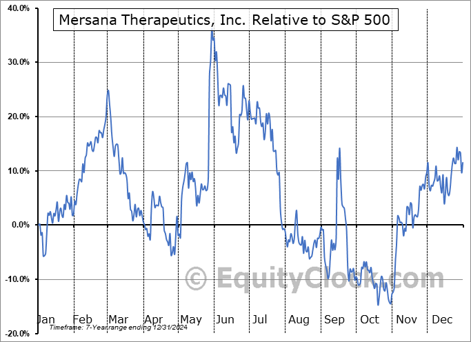 Analysis of the Mersana Therapeutics, Inc. (NASD:MRSN) seasonal charts above shows that a Buy Date of December 18 and a Sell Date of May 6 has resulted in a geometric average return of 7.91% above the benchmark rate of the S&P 500 Total Return Index over the past 7 years. This seasonal timeframe has shown positive results compared to the benchmark in 5 of those periods. This is a good rate of success and the return strongly outperforms the relative buy-and-hold performance of the stock over the past 7 years by an average of 46.12% per year.