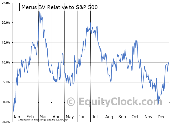 Analysis of the Merus BV (NASD:MRUS) seasonal charts above shows that a Buy Date of December 6 and a Sell Date of March 10 has resulted in a geometric average return of 34.4% above the benchmark rate of the S&P 500 Total Return Index over the past 8 years. This seasonal timeframe has shown positive results compared to the benchmark in 8 of those periods. This is an excellent rate of success and the return strongly outperforms the relative buy-and-hold performance of the stock over the past 8 years by an average of 39.25% per year.