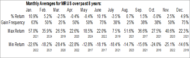A word of caution: Only 8 years of data is available for shares of MRUS, perhaps insufficient to create a seasonal profile that accurately gauges the seasonal tendencies influencing the investment. Ideally, while 20 years is preferred, at least 10 years of data is required to perform a seasonal analysis that is considered to be reliable for future seasonal periods.
