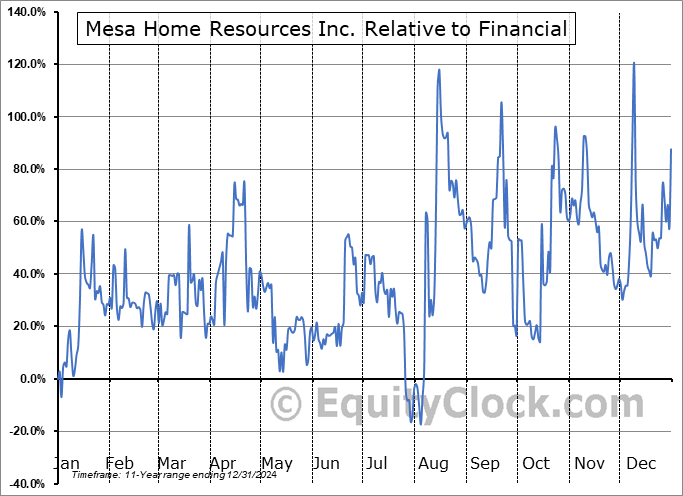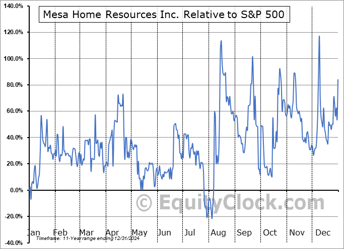 Analysis of the Mesa Home Resources Inc. (OTCMKT:MHRE) seasonal charts above shows that a Buy Date of October 9 and a Sell Date of January 16 has resulted in a geometric average return of 35.8% above the benchmark rate of the S&P 500 Total Return Index over the past 11 years. This seasonal timeframe has shown positive results compared to the benchmark in 8 of those periods. This is a good rate of success and the return strongly outperforms the relative buy-and-hold performance of the stock over the past 11 years by an average of 74.74% per year.