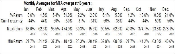 Analysis of the Metalla Royalty & Streaming Ltd. (AMEX:MTA) seasonal charts above shows that a Buy Date of November 19 and a Sell Date of March 13 has resulted in a geometric average return of 17.05% above the benchmark rate of the S&P 500 Total Return Index over the past 16 years. This seasonal timeframe has shown positive results compared to the benchmark in 13 of those periods. This is a very good rate of success and the return strongly outperforms the relative buy-and-hold performance of the stock over the past 16 years by an average of 7% per year.
