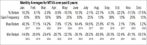 A word of caution: Only 8 years of data is available for shares of MTVA, perhaps insufficient to create a seasonal profile that accurately gauges the seasonal tendencies influencing the investment. Ideally, while 20 years is preferred, at least 10 years of data is required to perform a seasonal analysis that is considered to be reliable for future seasonal periods.