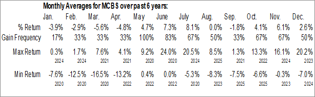 A word of caution: Only 5 years of data is available for shares of MCBS, perhaps insufficient to create a seasonal profile that accurately gauges the seasonal tendencies influencing the investment. Ideally, while 20 years is preferred, at least 10 years of data is required to perform a seasonal analysis that is considered to be reliable for future seasonal periods.