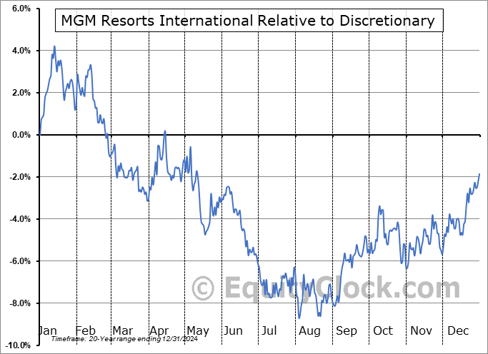 Analysis of the MGM Resorts International (NYSE:MGM) seasonal charts above shows that a Buy Date of October 28 and a Sell Date of January 16 has resulted in a geometric average return of 9.92% above the benchmark rate of the S&P 500 Total Return Index over the past 20 years. This seasonal timeframe has shown positive results compared to the benchmark in 16 of those periods. This is a very good rate of success and the return strongly outperforms the relative buy-and-hold performance of the stock over the past 20 years by an average of 19.52% per year.